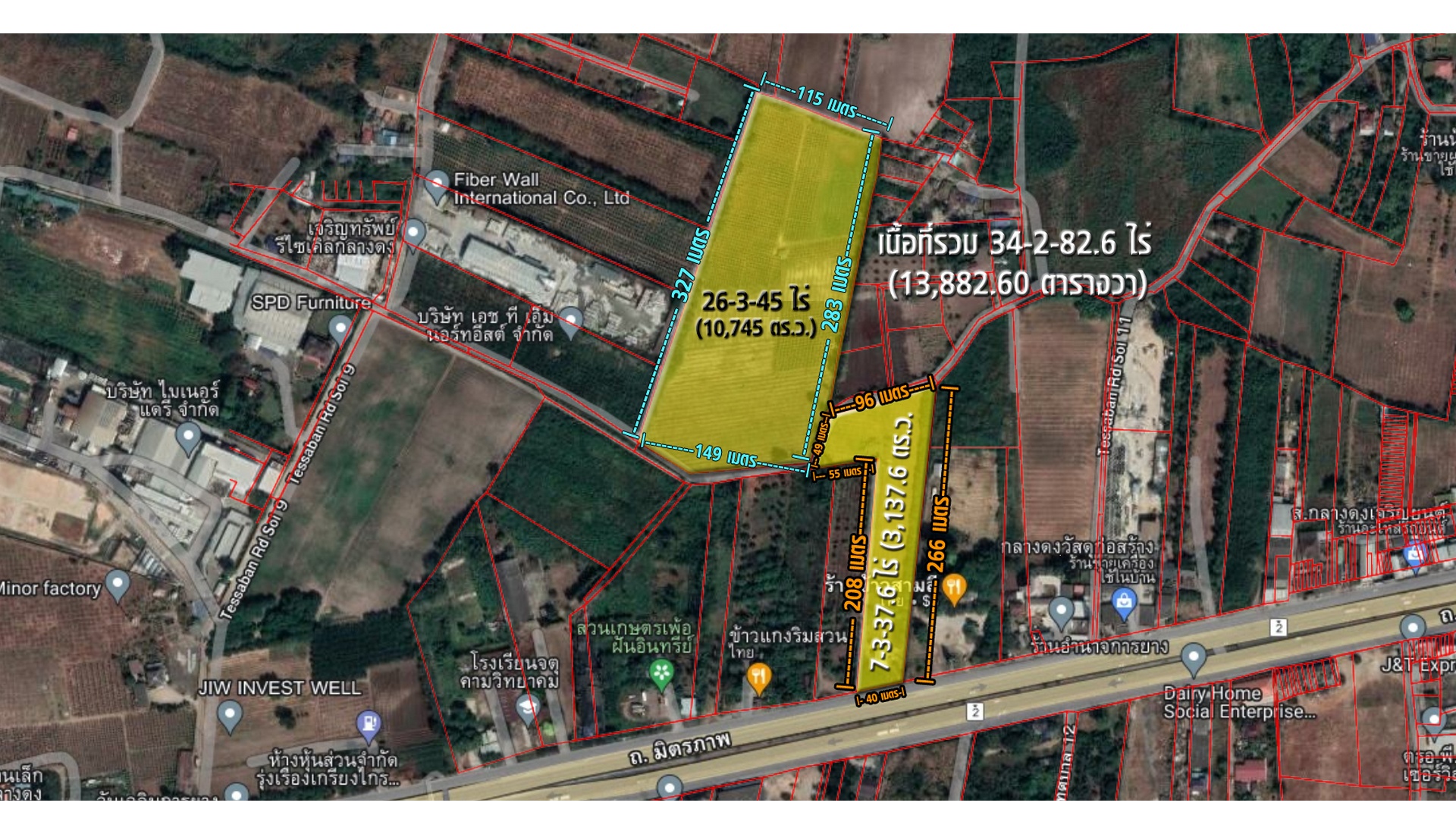 – แปลงที่ 2 เนื้อที่รวม 26-3-45 ไร่ (10,745 ตร.ว.) ด้านหน้าแปลงติดถนนซอยเทศบาล 11 หน้ากว้างประมาณ 149 เมตร ลึกสูงสุด 327 เมตร ด้านหลังแปลงกว้าง 115 เมตร