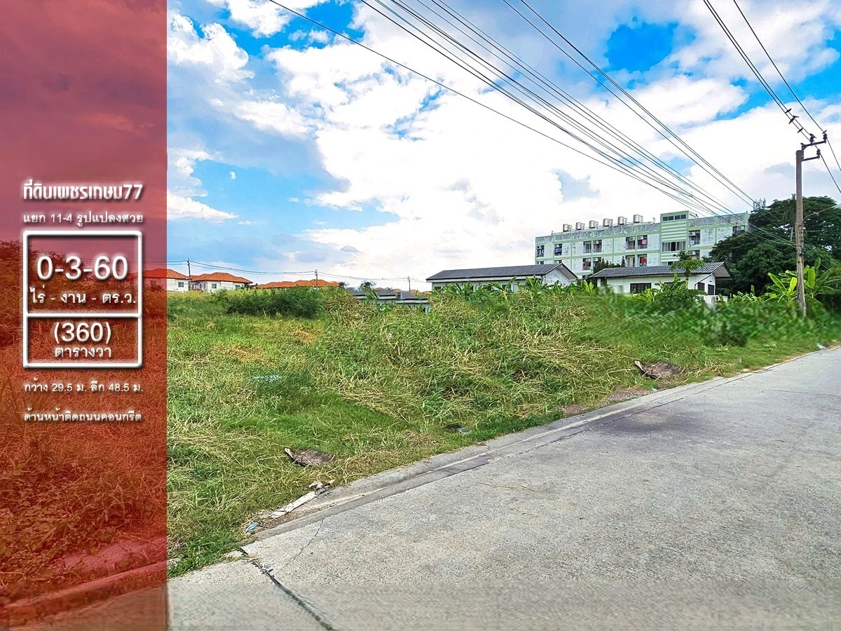 ขายที่ดิน เพชรเกษม 77 แยก 4-11 เนื้อที่ 360 ตารางวา ผังสีเหลือง ด้านหน้าติดถนนคอนกรีต ด้านหลังติดคลองบางแค ทำเลดี เดินทางสะดวก เหมาะลงทุนทำโครงการ