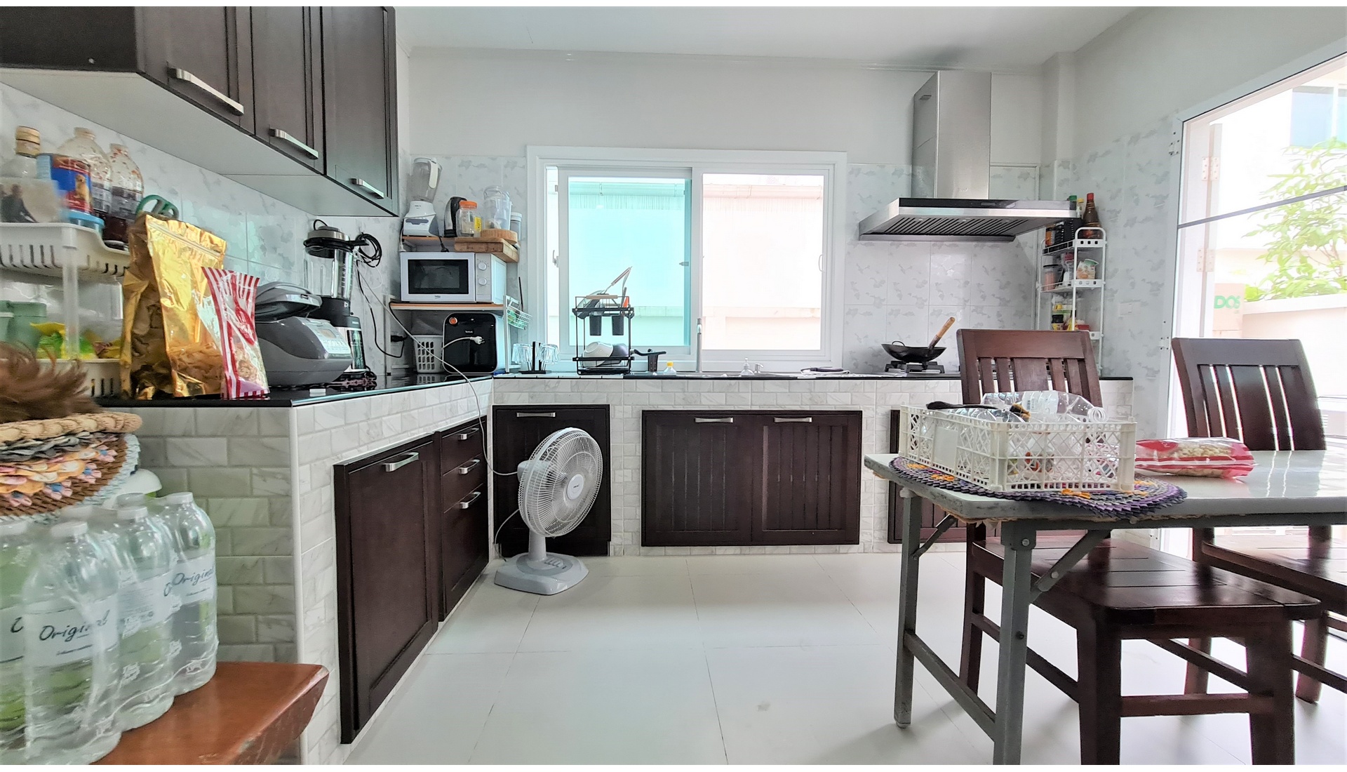 – ห้องครัวต่อเติมเคาน์เตอร์ครัว อ่างซิงค์ ตู้เก็บของใช้ภายในครัวแบบแขวนติดผนัง และใต้เคาน์เตอร์ครัว พื้นและผนังปูด้วยกระเบื้องอย่างดี พร้อมเครื่องดูดควันจากเตา