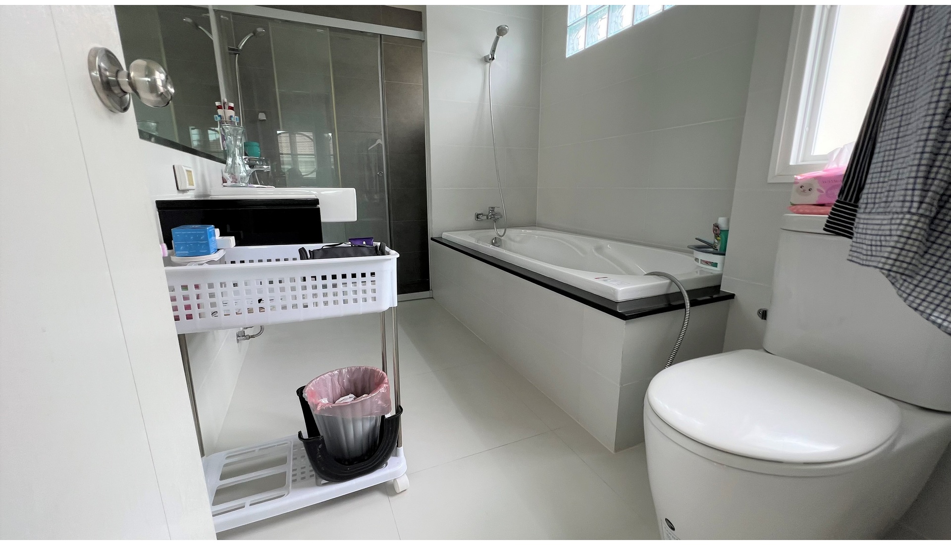 – ห้องน้าห้องที่ 3 บนชั้น 2 ใช้สุขภัณฑ์อย่างดี แยกส่วนเปียกส่วนแห้งด้วยผนังกระจก พื้นและผนังปูด้วยกระเบื้องเต็มพื้นที่เช่นเดียวกันกับห้องน้ำห้องอื่น ๆ