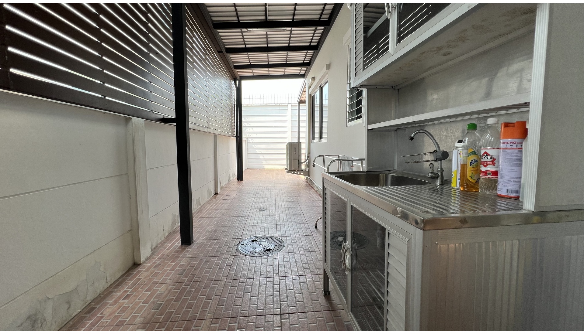 – ด้านหลังต่อเติมครัว มีหลังคาคลุมตลอดแนว พร้อมเครื่องดูดควันจากเตา พื้นปูด้วยแกรนิตโต้อย่างดี สภาพสวย